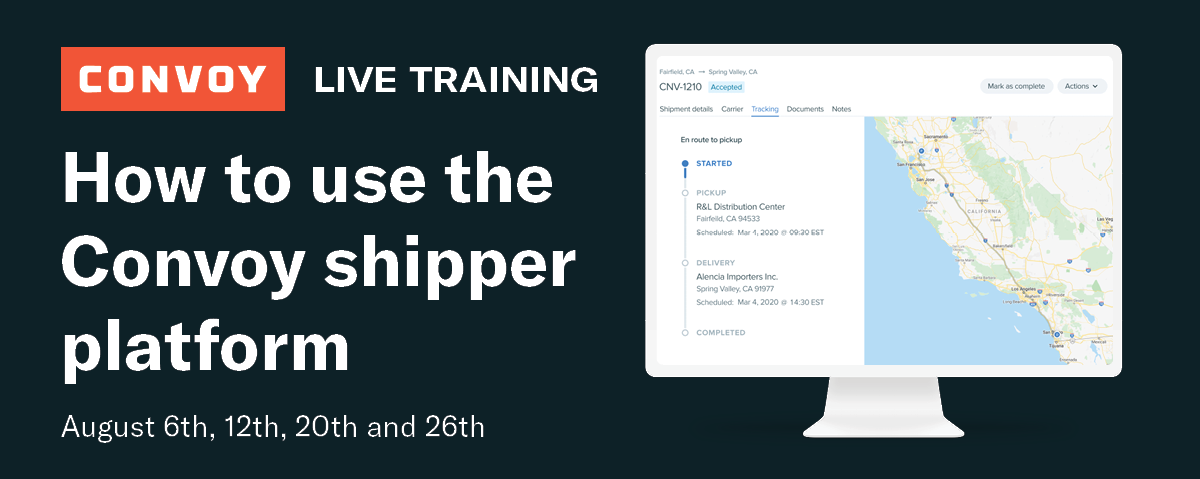 In this training session, a Convoy expert will teach you everything you need to know about quoting, booking, and tracking shipments with the Convoy shipper platform. Plus! Learn how Convoy’s digital freight network and team of operations specialists work behind the scenes to get your shipment delivered on-time and at-cost. There are currently no upcoming…